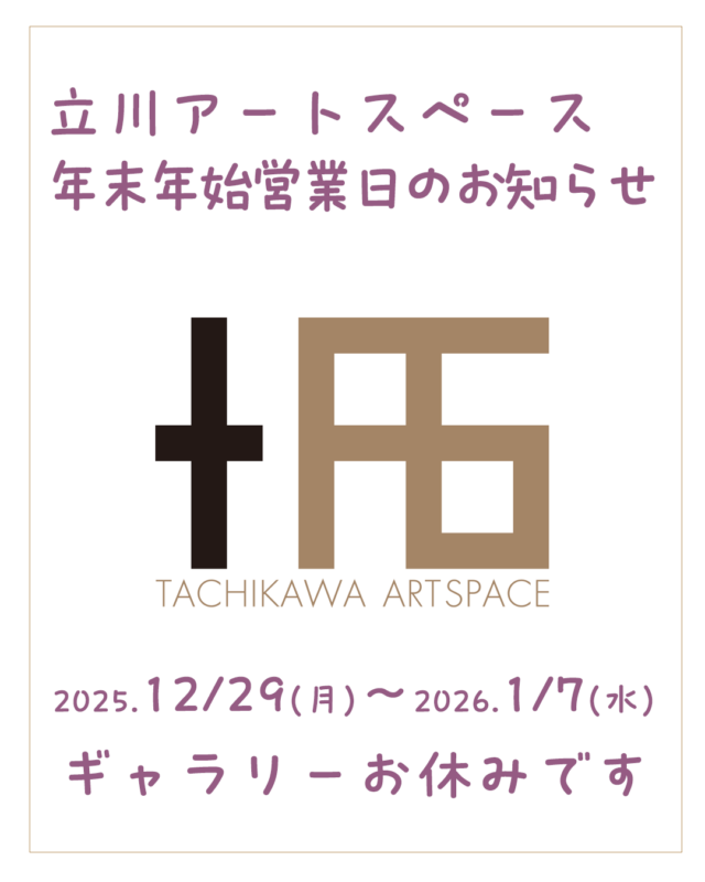 立川アートスペースは、2025年12月29日(月)〜2026年1月7日(水)の間、年末年始休業とさせていただきます。 期間中は会場にはスタッフ不在となりますので、ご来場を予定されている方はお気をつけください。 2026年 […]