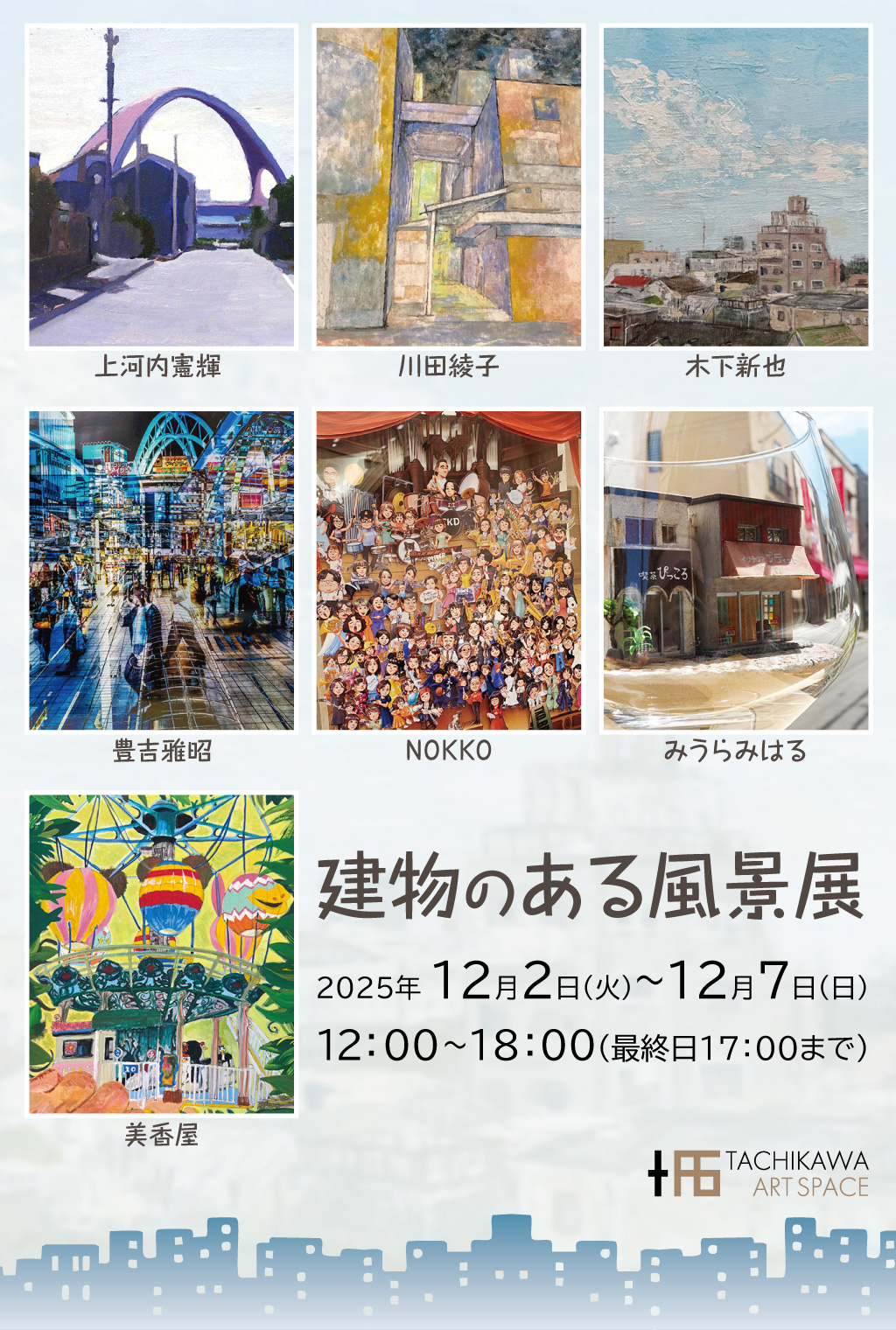 建物はただの構造物ではなく、風景の一部として、あるいは風景を変容させる存在として、人の営み・時間・記憶を内包する。今展では「建物のある風景」を多様な視点(写実・抽象・記憶・再構成・人との関係性など)から提示。閲覧者に「風景のなかの建築」「建築がつくる風景」を参加アーティストによる作品群から再認識して頂く。