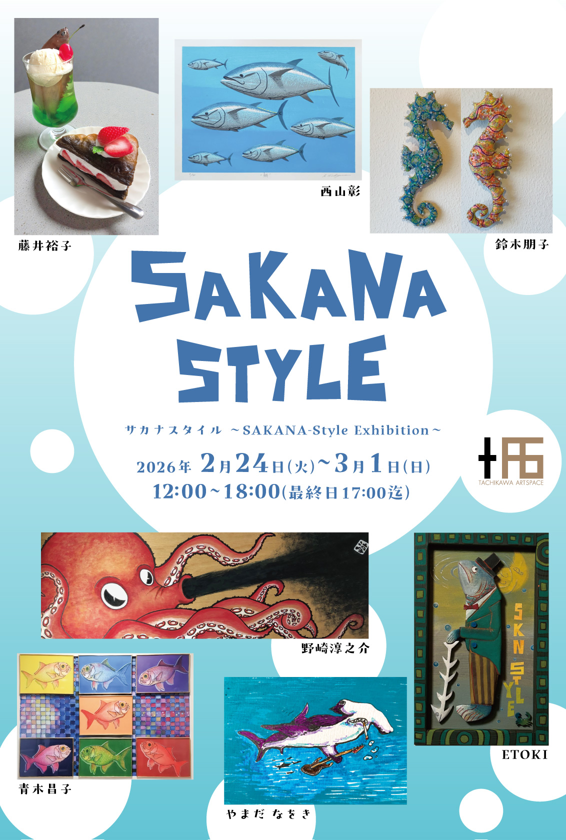 サカナスタイル 〜SAKANA-Style Exhibition〜 会期: 2026/02/24(火)〜2026/03/01(日) 時間: 12:00〜18:00(最終日:17:00) 様々なスタイルに変容する「サカナ」を7人の作家が独⾃の感性で表現する展示です。 参加作家 ⻘⽊昌⼦ ETOKI 鈴⽊朋⼦ ⻄⼭彰 野崎淳之介 ⾷品サンプルアーティスト 藤井裕⼦ やまだ なをき